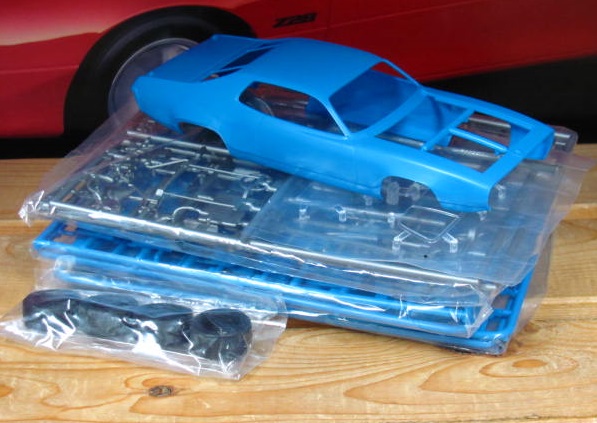 Salvino's JR Models 1971 Plymouth Road Runner. Complete donor kit. Body molded in blue, chassis parts molded in gray and black. Please use the link in this page to download the instructions. Be sure to add a Discount Priced Powerslide Brand Decal!