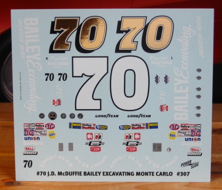 #70 Bailey Excavating Monte Carlo driven by JD McDuffie in 1978. Brand new sheet includes gold foil printed numbers. Designed to fit the new Salvino Monte Carlo.