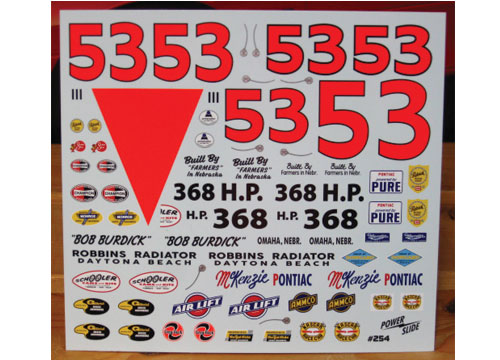 #53 Bob Burdick 1961 Pontiac. Includes options for 2 different cars. All new Powerslide sheet with high end florescent printing designed to fit the Moebius Models 1961 Pontiac kit.