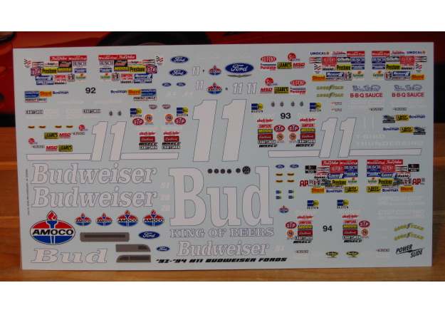 #11 Budweiser Thunderbird driven by Bill Elliott in the 1992-94 seasons. Fully complete and correct graphics sheet for the Bill Elliott Budweiser cars. Sheet includes all associate sponsors to build the cars from 1992 to 1994.