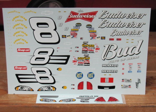 #8 Budweiser driven by Dale Earnhardt Jr. Sheet can build the 2006/07 Monte Carlo and also has graphics for the 2007 Impala COT