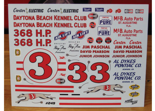 #3 Daytona Kennel Club 1961 Pontiac. Sheet has several options for the cars driven by David Pearson, Junior Johnson and Jim Paschal. All new Powerslide sheet with high end screen printing designed to fit the Moebius Models 1961 Pontiac kit.
