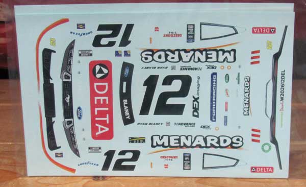 #12 Delta Menards Mustang driven by Ryan Blaney at Darlington in 2026. Use Salvino 2024/25 Mustang kit for donor. Please note these are high quality laser printed decals by MPR Decals.