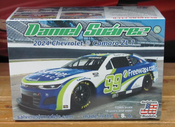 #99 Freeway.com 2024 Atlanta Winner Camaro driven by Daniel Suarez. All new tooling with highly detailed chassis. Body molded in color, chassis molded in gray and black. Kit includes high end Powerslide Brand Decals.