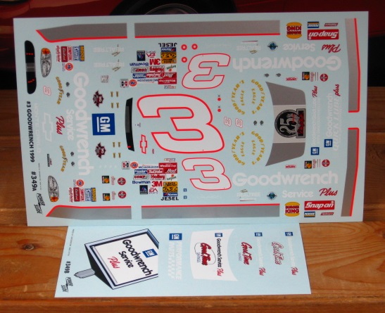 #3 Goodwrench Monte Carlo driven by Dale Earnhardt in the 1999 season. Sheet has numerous options for cars raced in 1999 including the Daytona 500 "25th Anniversary" and 3 different "Good Time Savings" Deck lid graphics. Sheet also has the famous "Sign" hood as raced at Bristol in 1999.