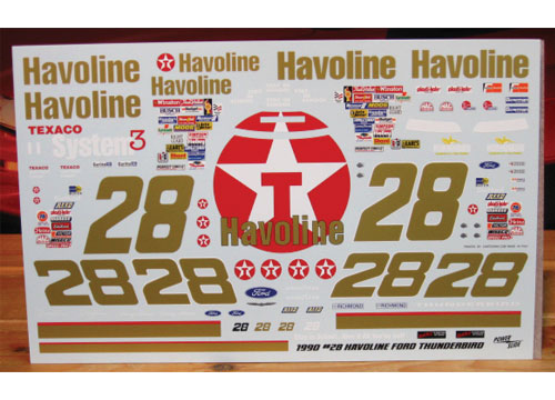 #28 Havoline Thunderbird driven by Davey Allison in the 1990 season. Sheet includes solid gold numbers as raced in Daytona as well as white outlined numbers which was how the car appeared the rest of the season. Numerous contingency options are also included.