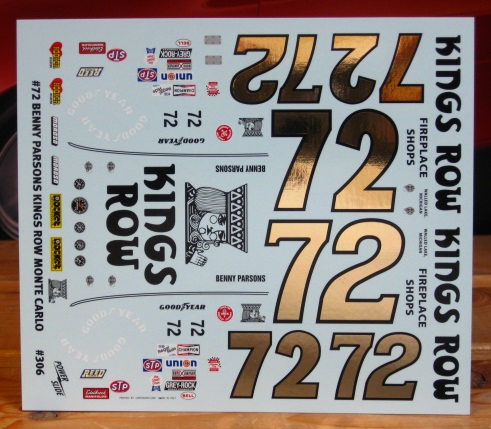 #72 Kings Row Monte Carlo driven by Benny Parsons in 1976. Brand new sheet includes two styles of gold foil printed numbers. Designed to fit the new Salvino Monte Carlo.
