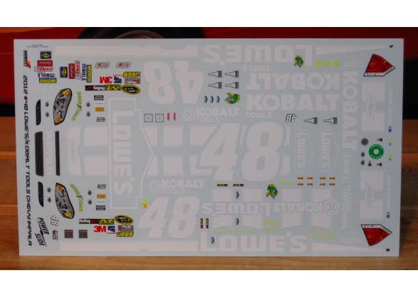 In Stock and Now Shipping! #48 Lowe's/Kobalt Impala driven by Jimmie Johnson in the 2012 season. Sheet has markings for either the blue "Lowe's" car or the black "Kobalt" car.