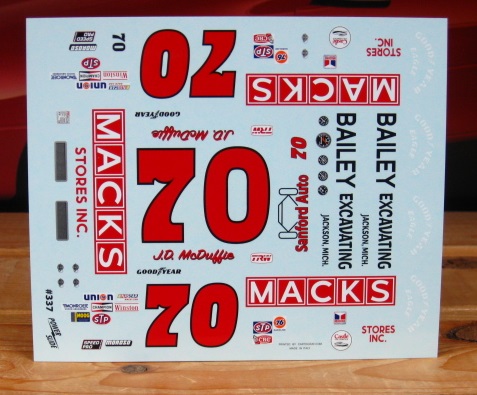 #70 Macks Stores Lemans driven by JD McDuffie in 1982. Sheet has options for two different cars. Designed to fit the new Salvino Lemans kit.