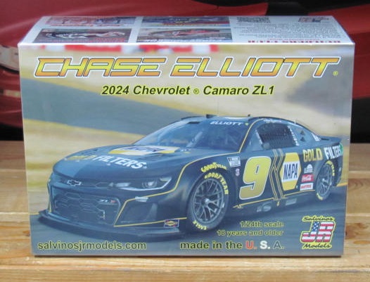 #9 Napa Gold Filters Camaro driven by Chase Elliott at Sonoma in 2024. Gen 7 Nascar kit with highly detailed chassis. Body molded in black, chassis molded in gray and black. Kit is Factory Sealed. Issued in 2024.