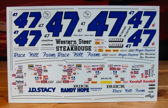 #47 Race Hill Farm Buick driven by Harry Gant and Ron Bouchard in the 1979-82 seasons. All new Powerslide sheet with lots of options for the Race Hill Farms cars including the 1979 Harry Gant Olds and the 1984 Ron Bouchard Talladega winner. Sheet also can be used on the 1986/87 Buick LaSabre resin body to do the Morgan Shepherd car. Sheet can is designed to be used with the Salvino Olds and Monogram Buick.