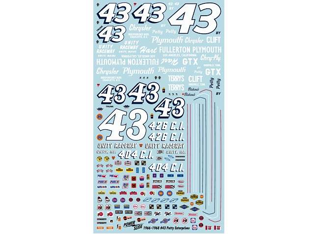 #43 Plymouth driven by Richard Petty in the 1966-1968 seasons. Sheet includes graphics for several versions of the Petty cars including the 1966 Daytona Winner, 1967 World 600 Winner, plus the alternate number style car raced at Riverside in 1967.