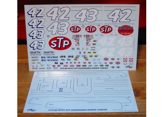 #43 STP Olds and Monte Carlo driven by Richard Petty. Sheet includes all the correct markings for the 1979 Daytona 500 winner. Sheet also has numerous options for both 1979 and 1980 season cars and includes the blue pinstriping for the Olds and the Monte Carlo. Sheet even includes #42 Kyle Petty options.