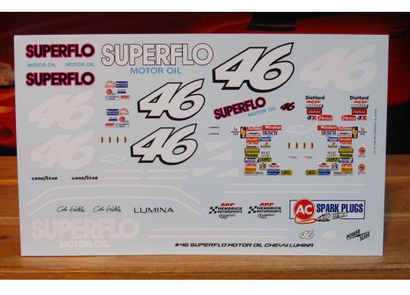 #46 Superflo Lumina driven by Cole Trickle in the Days of Thunder movie. This is a reprint with new updated artwork including white underlays for the numbers.
