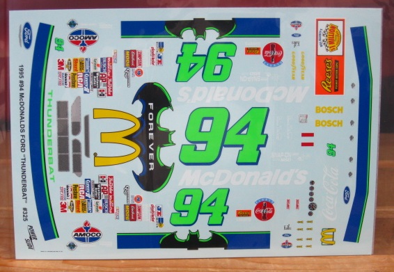 #94 McDonalds Batman Forever "Thunderbat" driven by Bill Elliott in the 1995 season. All new decal from Powerslide with Cartograf printing and beautiful day glo colors.