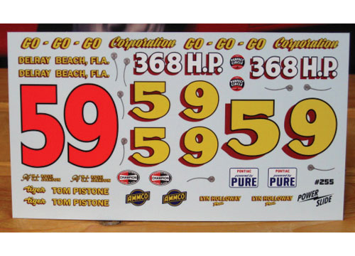 #59 Tom Pistone 1961 Pontiac. All new Powerslide sheet with high end florescent printing designed to fit the Moebius Models 1961 Pontiac kit.